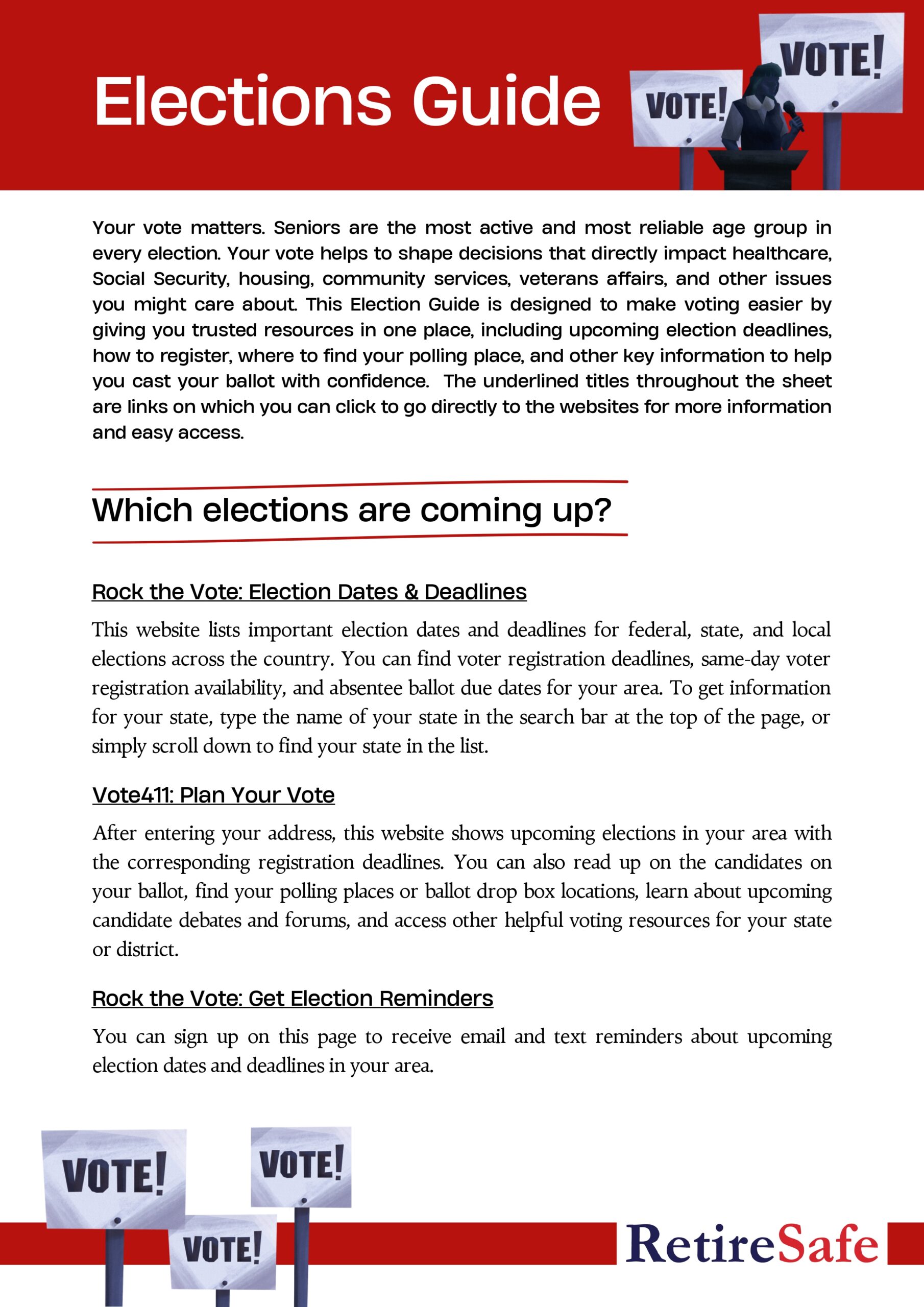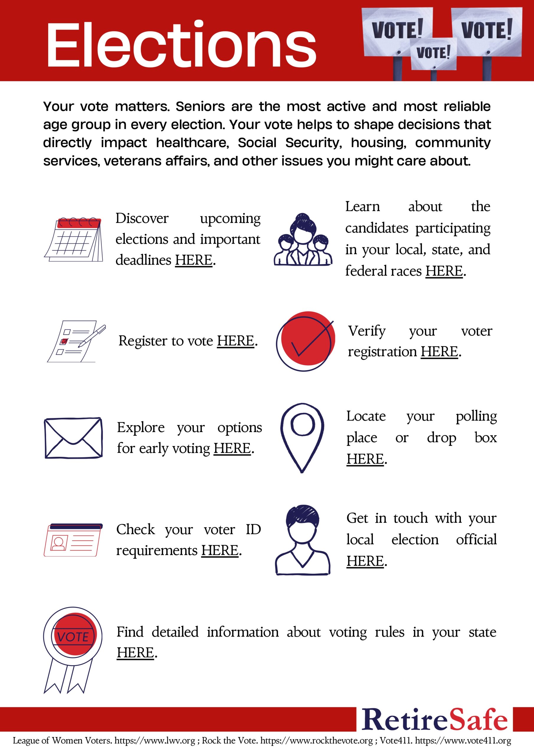 RetireSafe’s efforts to educate and advocate mean very little if they are not backed by your vote! We have compiled an Election Guide below with trusted resources, websites, and key information to help you participate in your local elections. Every election is an opportunity to make your voice heard and protect the future you helped build. RetireSafe strongly encourages you to do your part and VOTE!